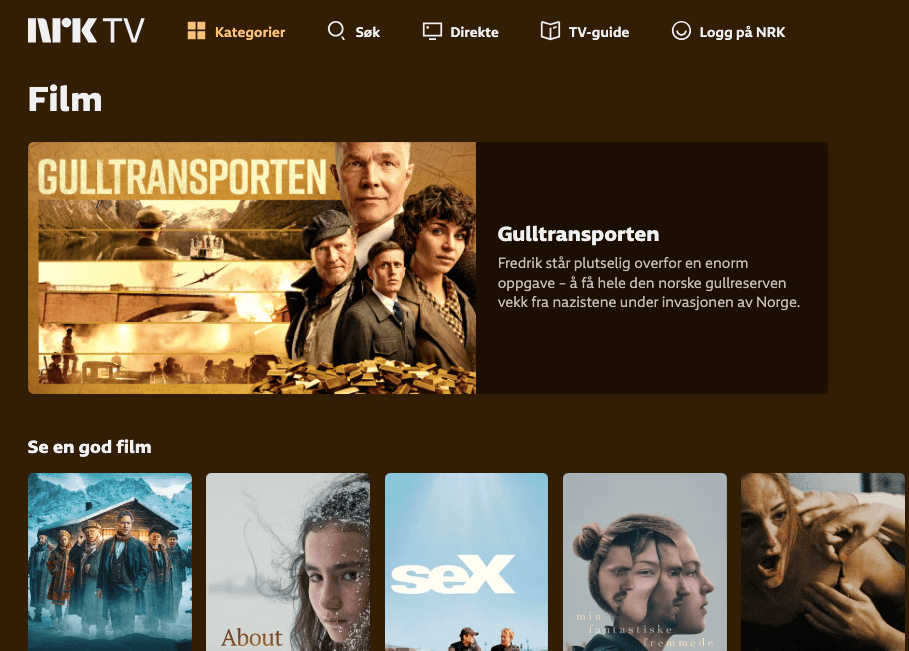 NRK tilbyr et utvalg av filmer og alt innholdet er gratis. De skiftes ut med jevne mellomrom og du kan både se norske og internasjonale filmer.